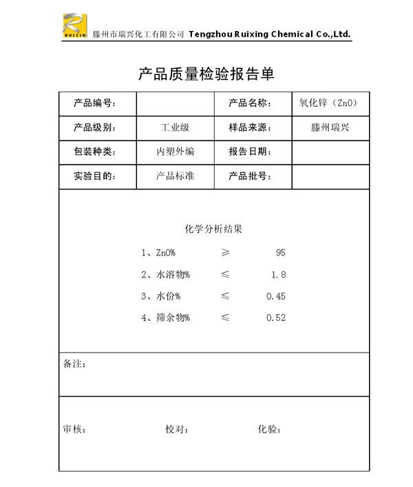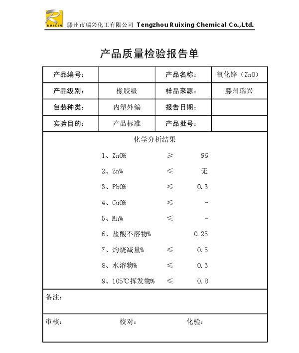 瑞興化工有限公司是生產(chǎn)氧化鋅的重點企業(yè),于2008年通過ISO9001:2008質(zhì)量管理體系認證。“瑞興”牌氧化鋅在國內(nèi)擁有較大穩(wěn)定的市場,并遠銷東南亞、中東、中南美等國家和地區(qū),在國內(nèi)外享有較高聲譽。